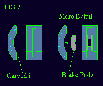 The diagram above left shows two completed discs. Two at a time should be made so they are exactly the same. The diagram at the right shows two methods of making your disc vented. The sample at the left is similar to what is done in the aftermarket kits. The method on the right is individual vents are cut from sheet aluminum and glued to one side of the disc. Each method is very time consuming and I have to admit I haven't had much success with the method on the right. The hard part is trying to get the slots lined up evenly so it doesn't look sloppy. If you have any ideas I would like to hear them. Keep in mind that I would like to make this using tools that most modellers have access to.