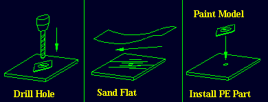 Drill hole in the middle where the new photo etched item is to go. (In this case we are replacing a dzusses 1/4 turn fastener). Next sand off the kit part. Paint the kit part and when this is dry glue the new part on