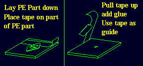 After following the first two steps as above this is a method of lining up the parts correctly. Place the PE part onto the model in the desired location. Place a piece of tape over all or part of the PE part. Lift the tape and PE part slightly so that some of the tape is still on the model and all of the PE is off the model. Apply a small amount of glue to either the model or PE part. Not too much or it will squeeze out when you put the part down.