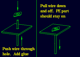 This method can be used every so often. After following the first two steps you thread a wire through the hole. Add a touch of glue to the tip then put the PE part on this. Pull the wire down through the model and the PE part and glue will be left on the model. This method is mainly used for CA glues. The tape method has problems with the glue getting all over the tape then onto the model
