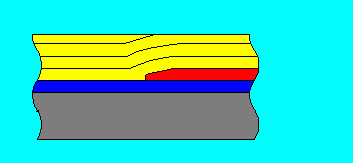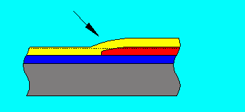 Here is an exaggerated cross section of a model finish with the bottom layer being the plastic. The middle layer is the primer while the red is the paint job. What you are going to try and do is to sand away the hills until the paint is completely flat.