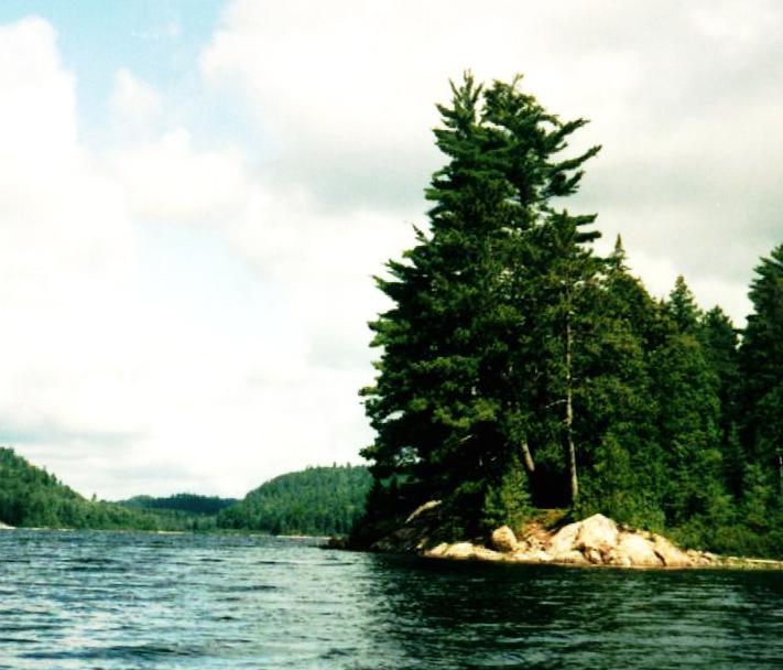 cottagers' boats lying on both shores.) Pog' Lake is large, not quite 20 km long, and waves can build up quickly. You will want to head south on this lake, but if you should consider a visit to the north end, there is a large campsite on Picnic Island in the northern end of the lake. Other good sites are: right at the sand spit where you entered Pog' Lake; then 3 km south on the western side at the north shore of the bay where the Pogomasing River enters the lake (take care not to trespass onto private land that is nearby); and there are a few suitable sand beaches in the middle and southern parts of the lake. You will travel to the south, but if you have time to spare, you could make a further side trip up the Pog' River into Little Pog', Dennis and Gilden Lakes and then to Sinaminda Lake. I have seen moose and bald eagles on such an excursion and found it well worth while. Pog' itself had a Hudson's Bay post on Kingston's island. It is probably the one where Grey Owl's friend, Alex Espaniel, was born. As Grey Owl was trapping in the area during two winters in the early 1920's, he very likely was familiar with this old Bay post. Today, there is nothing left of its buildings: I am told they were razed when the last factor's wife had died. (1) To continue your trip, head into the narrow southwest bay of Pog' Lake (called Dunlop