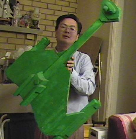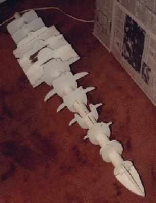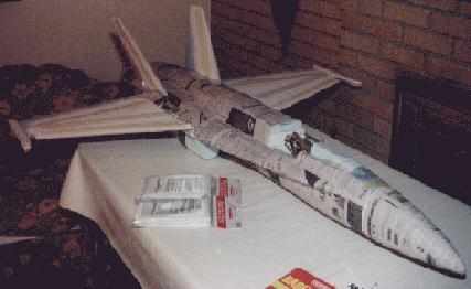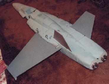 Styrofoam inside. Wood wings and flashlight surrounds for the afterburners. You can barely see the four eye hooks for the guide wires for flying the thing