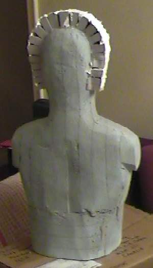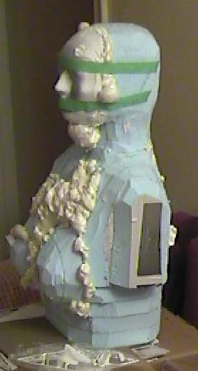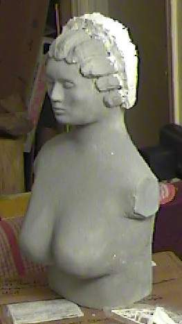 Latest project was a female bust for the theatre show "A Funny Thing Happened On the Way To The Forum" (whew). The expanded foam was used to fill in gaps between the styrofoam since I needed a smooth surface. The face was actually a plaster casting from a kids Halloween costume.