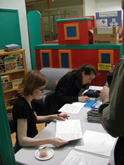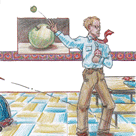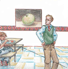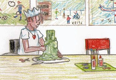 2. Wendy and her classmates play basketball , page 30 3a) "At lunchtime, she would shoot her peas/ Between the supervisor's knees" Wendy torments the lunchroom supervisor, page 10 3b) Wendy, in her wheelchair, continues to torment the lunchroom supervisor, page 28 4. Wendy scuplts in plasticine, page 27 (detail) All images except for 1, coloured pencil on paper Sarah Ennals 2001 All photographs by Andrew Specht, 2002 |