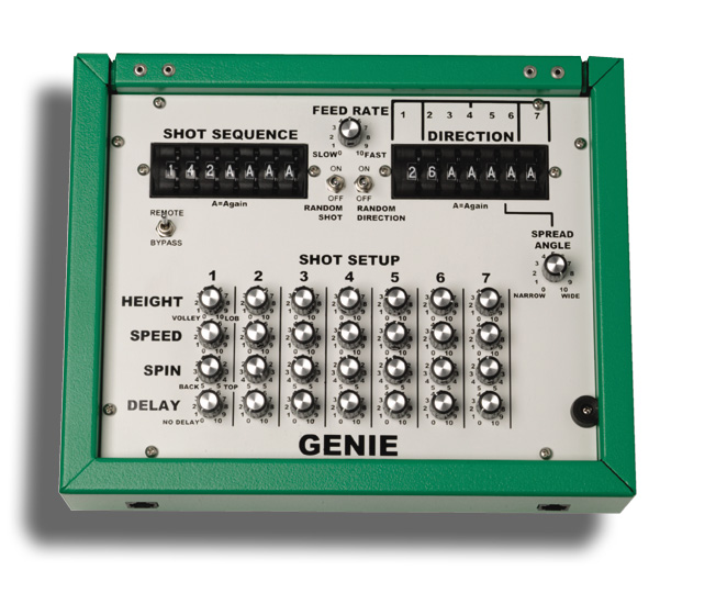 The GENIE is a powerful tool for teaching tennis. Realistic game situations with up to 7 shots can be practiced. Groups of students can practice drills such as ground-stroke, approach, lob to 2 lines feeding the balls every 1 and 1/2 seconds. Or if you are practicing at home, you can throw 2 ground strokes followed by an approach shot followed by a volley followed by a lob. Don't forget, this ball machine is perfect for teaching doubles teams too! You can purchase this machine now and buy an upgrade later that will turn it into the ultimate ball machine, the PLAYMATE PC. KEY FEATURES