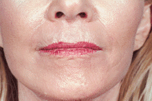 It has been mentioned in the preceding sections that the fine wrinkles of dry, weather-beaten skin with transverse creases of the forehead or vertical etching of the upper and lower lips cannot be removed by the face lift. These effects of aging are best treated by the chemical face peel; Fig. 29; Fig. 30 or laser; Fig. 31; Fig. 15. The results of this treatment are frequently described as the exchange of "prunes for peaches". In some instances the chemical peel may also help the dark circles which some people have under their eyes.