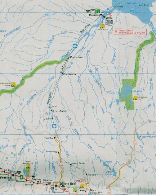 The trip started in Smooth Rock Falls and ended in Moose River Crossing, about 2 days paddle from Moosonee. The retun was done by train and hitch-hiking. For train information, contact Ontario Northland. The name of the river comes from the Anishnabe (Ojibwe) word "madágami" which stands for "troubled or agitated water" (Frederic Baraga's Dictionary of the Ojibway Language of 1853).