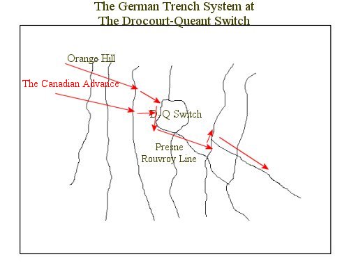 A week after the Amiens offensive was finished the Canadians were ordered back to the Vimy sector to to begin plans for the attack on the Drocourt-Queant line. Drocourt-Queant was the space or hinge of the main German defensive lines connecting the original defensive trench from 1914 to the new Hindenburg Line. The task was huge and the time for planning quite brief. Within 3 days the Canadians were to come up with a plan of attack through the old British and German positions plus the 5 new German defence lines. This would bring them to the Drocourt-Queant Switch which was 1.5 kilometres deep and supported by 3 lines of barbed wire positions.