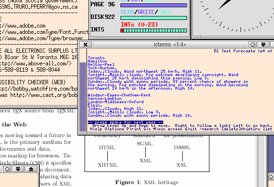Reproduced here is a small piece of one screen from my four-screen environment, showing at this particular instant in the workflow the bottom edge of a (time-server-synchronized) clock, the bottom edge of the system-monitoring xosview tool, the left edge of a home-made address book maintained with the plain-text vi editor (why waste time on address-book bloatware?), a portion of an xpdf viewer, two minuscule xterm chunks, a tiny chunk of the navy-blue desktop surface, and pretty well all of lynx.
