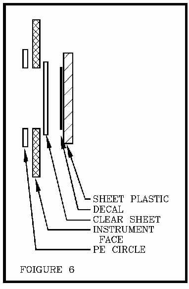 This method raises the clear sheet away from the decal for a bit of depth. The clear sheet has to be cut perfectly so that when the PE part is installed onto the instrument face no clear sheet is shown. The clear sheet should be as thin as possible so the pe circle isn't raised too far off the instrument face. Use clear sheet such as those found wrapping model kits, cds, tapes, etc.