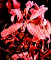 Catalog # 75 - A beautiful indoor ornamental with small heart shaped emerald green leaves which go to sleep every night no matter where they are located across the globe. The internal time clock on these and other rainforest seedlings are amazing. Bountiful and elegant 2" (5cm) flowers are pink-purple and resemble prized Orchids, named after the Bauhins, two medical brothers who had devoted their life to the botanical region of medicine. Also referred to as the butterfly tree for its ability to attract said species. (Also see Love tree, Bauhinia Alba in our catalogue). |
