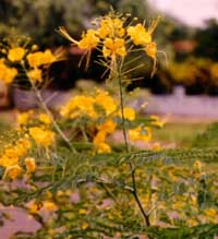 Catalog # 77 - Attractive mimosae leaf style foliage. Terminal inflorescence with five flaring golden yellow clusters across and displaying handsome long red stemans. A desirable and easy to grow indoor houseplant. Likes indirect sunlight. Not to be confused with Bird of Paradise (strelitzia reginae).